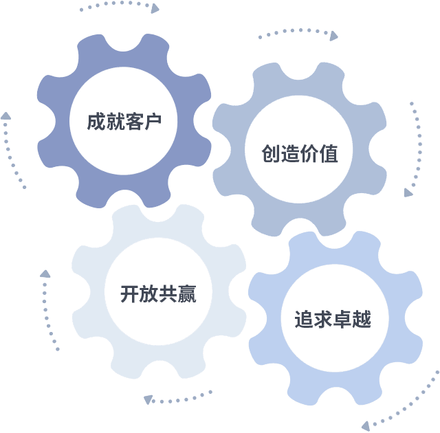 成就客户是一切决策的出发点,,,,创造价值是衡量所有工作的标准,,,追求卓越是304am永利做事做人的态度,,,,开放共赢是304am永利的格局也是最终的结果。。。。价值观的齿轮环环相扣,,推动着组织里的每个人不断向前。。